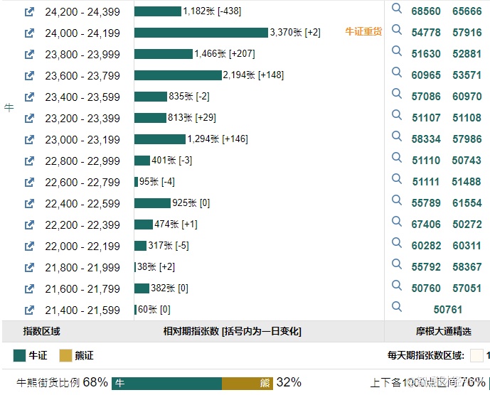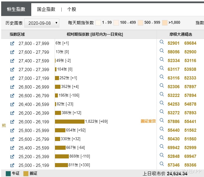 智通财经APP获悉,截至9月8日,恒指最新的牛熊街货比例68:32。摩根恒指牛熊证街货分布图中的数据显示,熊证街货重货区在26000 - 26199区间,该区间最新熊证数量为1822张,较上一交易日增加69张,最多新增25000 - 25199区间,该区间最新熊证数量为811张,较上一交易日增加330张。牛证街货重货区在24000 - 24199区间,该区间最新牛证数量为3370张,较上一交易日增加2张,最多新增区间也在此。最多新增23800 - 23999区间,该区间最新牛证数量为1466张,较上一交易日增加207张。