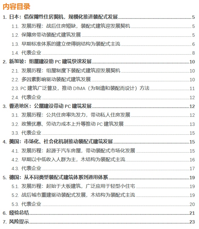 4)从结构体系看,发达经济体依据各自国情地区等特点,出现差异化发展。日本、美国、德国实行土地私有制且大部分地区人口密度较低,且成本相比钢结构、木结构更低,因此在建筑结构上更多地选择低层建筑,多采用质量较轻、工期较短且建造更为方便的轻钢结构住宅和木结构住宅。新加坡、香港地区实行土地公有制,且人口密度大,因此采用的是多高层PC建筑。
