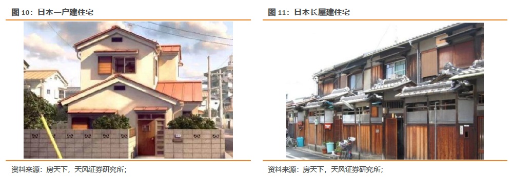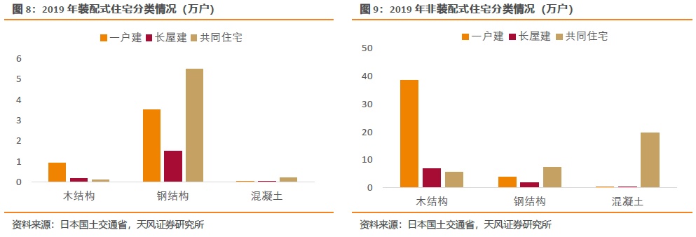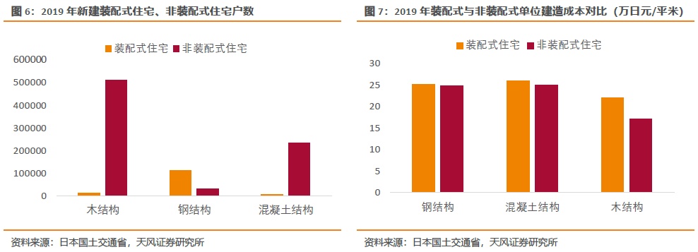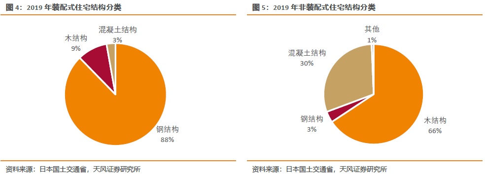 2019年非装配式住宅中木结构、钢筋混凝土结构、钢结构占比分别为66%、30%、3%。木结构远高于PC结构,主要原因有:1)日本的森林覆盖率高达66.8%,日本民族自古就有喜爱木建筑的传统;2)传统木结构从外观和功能来看相对简陋,建造成本更低,较PC结构低32.7%;3)日本受多地震、多台风等影响,加之传统的居住习惯,住宅以低层独栋住宅为主,多高层公寓为辅。木结构主要应用于低层独栋住宅,钢筋混凝土结构主要应用于多高层公寓。