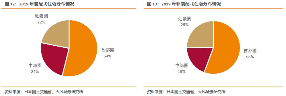分地区来看,装配式住宅和非装配式住宅分布情况类似,集中分布在首都圈。2019年新建装配式住宅中首都圈占比超一半,主要原因是以东京为首的大都市圈人口多,密度高,住房市场需求大,而偏远地区人口分布较为稀疏,市场较小,难以形成较强的规模优势。