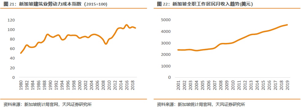 新加坡的组屋制度始于1960年。当时新加坡整个社会发展落后,民众住房条件较差。因此,总理李光耀提出了“居者有其屋”的口号,将解决住房问题作为一项基本国策,并于1960年成立了建屋发展局(HDB)主导组屋建设。不过由于新加坡的本国工人短缺,外籍劳工雇佣价格上涨与供应不足,半熟练和低成本的外劳导致建筑业生产率过低,工程质量也难以保证。同时,劳动力资源的缺口也带来了人力成本的上涨。根据新加坡统计局数据,自2001年以来,新加坡全职工作居民月收入持续攀升,由2001年的2387美元上涨到2019年的4563美元;1980年以来建筑业劳动力成本指数也呈上升趋势,因此我们推断建筑业劳动成本也呈现上升趋势。