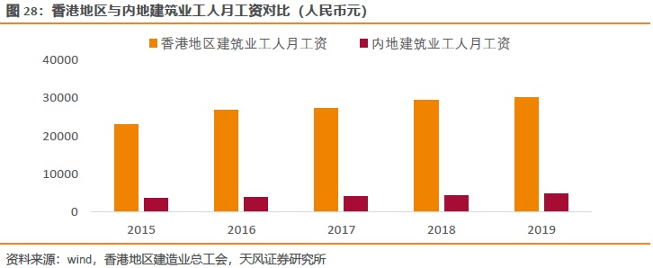 早期香港地区的PC建筑应用于政府主导的公屋房,随着政策推动、劳动力成本上升等因素影响,开发商开始将PC结构应用于私有住房领域。从预制构件使用情况来看,2000年以后PC建筑使用的预制构件(预制外墙、预制楼梯、预制楼板等)开始增加,PC预制率有了显著提升。我们认为,其主要原因是提高预制率可以节省工期,提高开发商资金周转效率,而增加预制构件带来的成本增量与香港地区的地价相比影响很小。