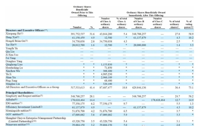 IPO前,小鹏汽车董事长、CEO何小鹏持股为31.6%,为大股东;夏珩持股为4.9%;顾宏地持股为2.8%;何涛持股为1.6%;