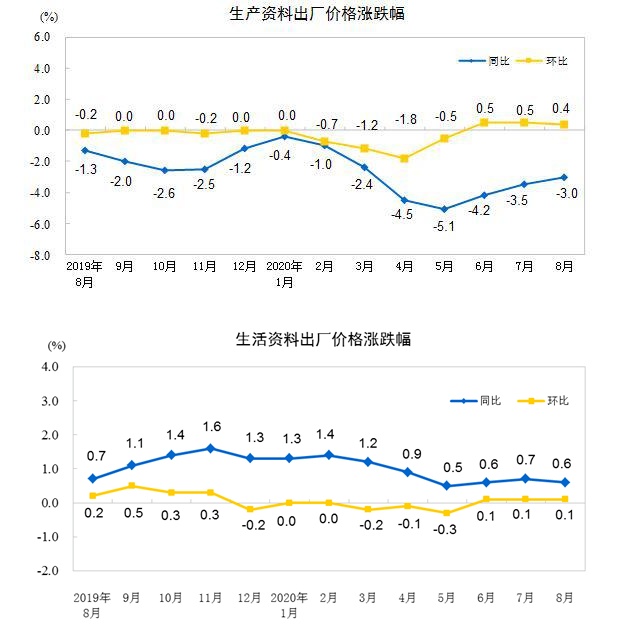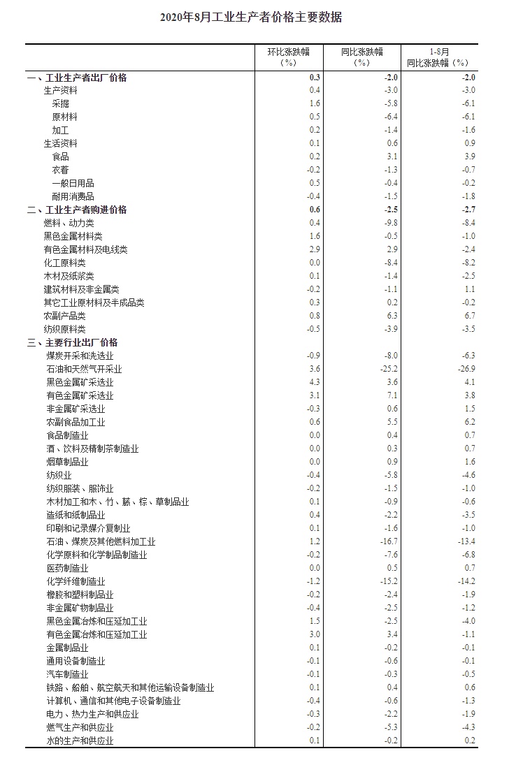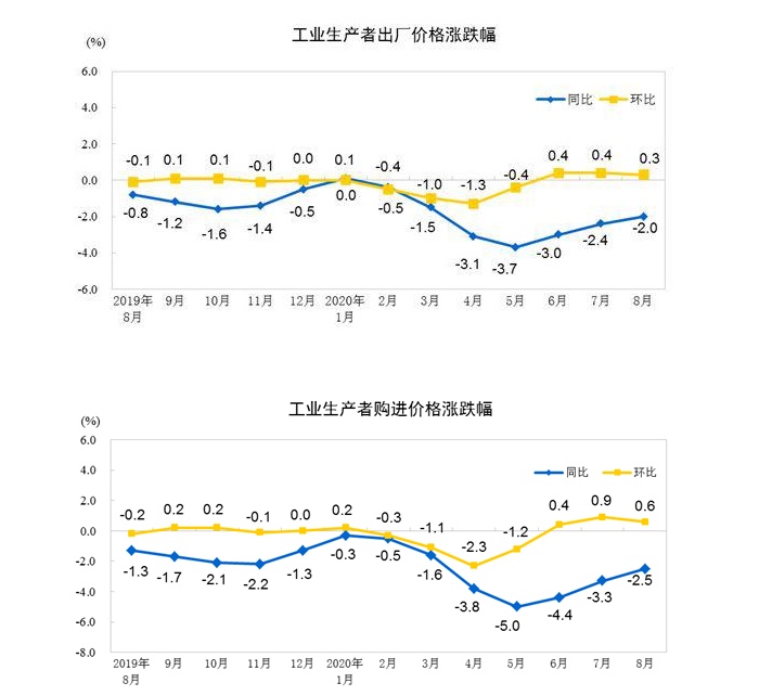 智通财经APP获悉,国家统计局数据显示,2020年8月份,全国工业生产者出厂价格同比下降2.0%,环比上涨0.3%;工业生产者购进价格同比下降2.5%,环比上涨0.6%。1―8月平均,工业生产者出厂价格比去年同期下降2.0%,工业生产者购进价格下降2.7%。