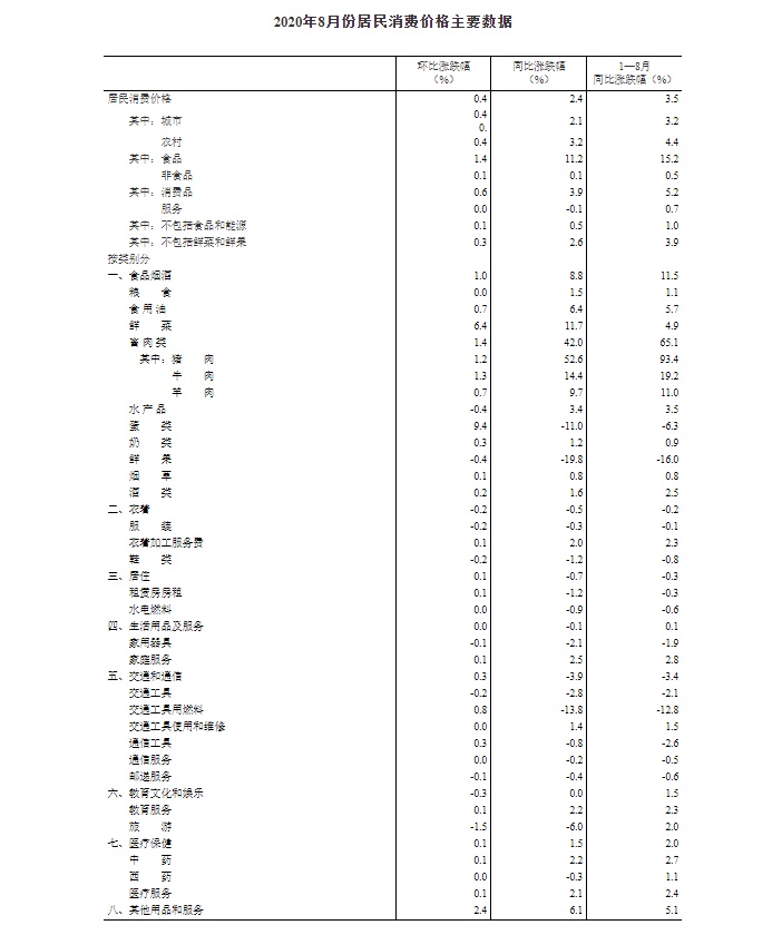智通财经APP获悉,据国家统计局9月9日公布,2020年8月份,全国居民消费价格同比上涨2.4%。其中,城市上涨2.1%,农村上涨3.2%;食品价格上涨11.2%,非食品价格上涨0.1%;消费品价格上涨3.9%,服务价格下降0.1%。1—8月,全国居民消费价格比去年同期上涨3.5%。