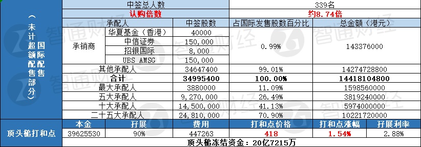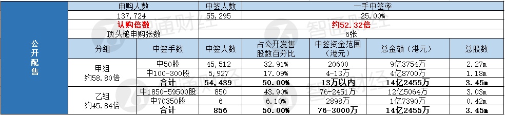其中,公开配售申购人数137724人,一手中签率25%,认购倍数约52.32倍。