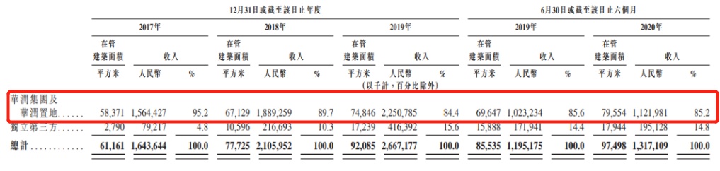据招股书显示,华润集团及华润置地为华润万象的两大客户,2018年至2020年上半年所贡献收入合共分别占总收入的32.2%、32.3%、36.0%。其中,华润万象生活为华润集团及华润置地所提供的住宅物业管理服务产生的收入更是占据住宅物业分部总收入的89.7%、84.4%、85.2%。