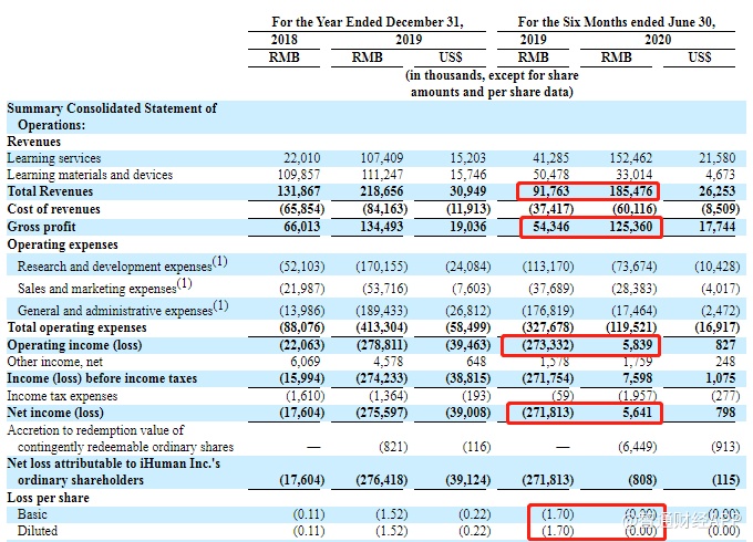 根据招股书中的财务报表,在截至2020年6月30日的6个月,洪恩教育总营收为1.85亿元(人民币,下同),同比增长102.1%;毛利润为1.25亿元;营业利润583.9万元,去年同期亏损2.73亿元;净利润为564.1万元,去年同期亏损2.72亿元;基本和摊薄后每股收益为0元,去年同期亏损1.7元。