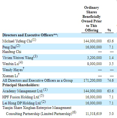 公司董事兼首席执行官Peng Dai通过Lei Hong DP Holding Ltd.实益持有1600万股普通股,持股占比为7.1%。