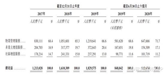 按类型来看,物业管理服务依然是公司最主要的收入来源,2017-2019年该板块收入占比约为68%左右,2020年前6个月,该板块收入占比提升至71.7%。非物业增值服务收入次之,收入占比基本上稳定在20%附近,社区增值服务收入占比最小,不到总营收比例的15%。