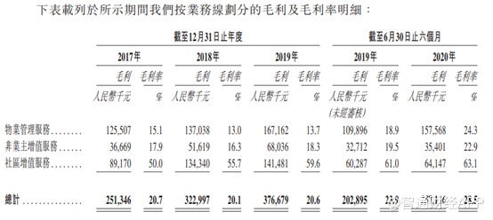 再看销售毛利率。2017年度至2020年上半年,公司的总毛利率分别为20.7%、20.1%、20.6%及28.5%,导致2020年上半年销售毛利率大幅增加的主要原因为物业管理服务成本得以优化以及公共卫生件导致社保减免,因此毛利率得以提升。