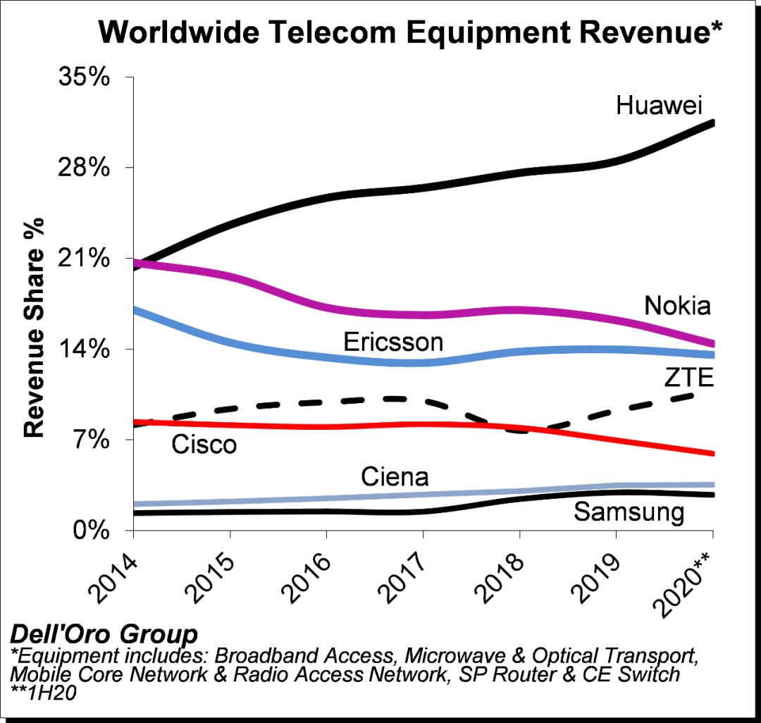 智通财经APP获悉,9月8日,全球知名市场研究公司Dell'Oro Group透露了2020年上半年全球TOP电信设备制造商的市场份额。报告显示,华为、诺基亚(NOK.US)、爱立信(ERIC.US)、中兴(00763),思科(CSCO.US)、Ciena(CIEN.US)和三星位居全球电信设备供应商前七名。