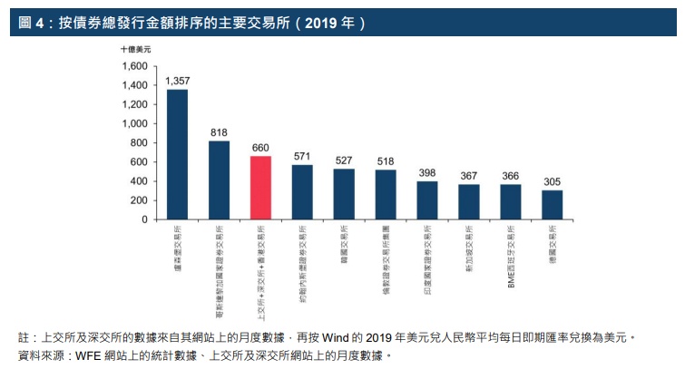 就债券发行量而言,上交所、深交所与香港交易所合计于2019年位列全球第三,卢森堡交易所居首。