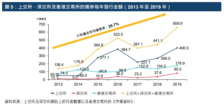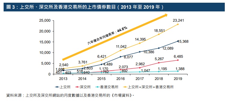 内地与香港合计的上市债券数目由2013年年底的2,540只增至2019年年底的23,241只,六年之间的复合年均增长率达44.6%(上交所:44.5%;深交所:55.9%;香港交易所:22.9%)。