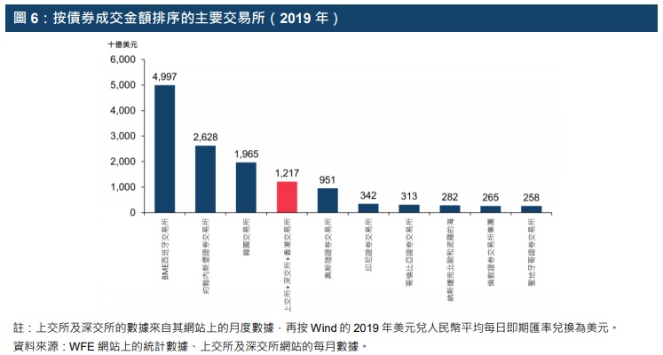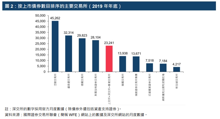 就债券数目而言,2019年年底,上交所、深交所与香港交易所合计位列全球第五,紧贴欧洲的主要交易所。泛欧交易所5及卢森堡证券交易所(卢森堡交易所)于2019年分别位列第一及第二。