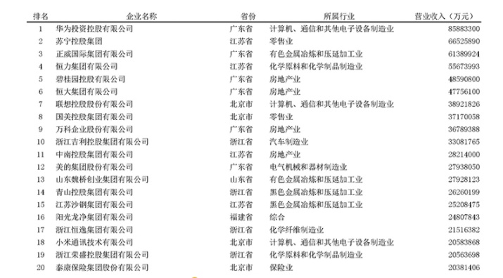 榜单显示,华为投资控股有限公司营业收入突破8000亿元人民币,蝉联民营企业500强榜首、制造业民营企业500强榜首。苏宁控股集团居服务业民营企业100强首位。