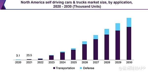 根据Grand View Research数据,美国自动驾驶汽车市场预计在2020年达到6.7万辆,到2030年增长到90万辆。