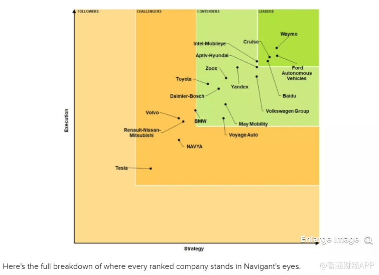 上图来自Navigent,讨论的是自动驾驶领域各公司的排名,Alphabet(GOOGL.US)旗下子公司Waymo目前处于行业领先地位。