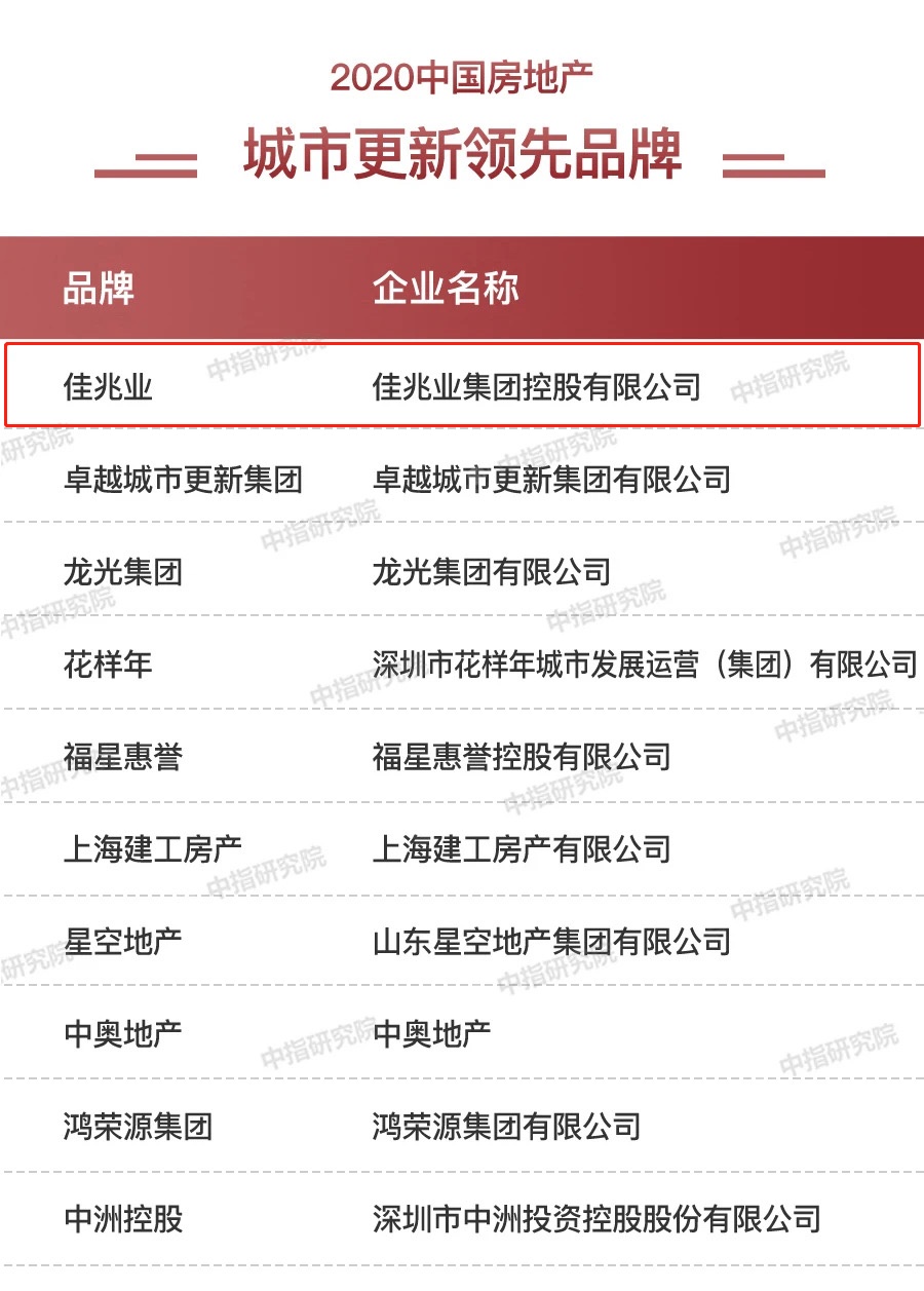 智通财经APP获悉,9月10日,由中指研究院、中国房地产TOP10研究组联合主办的“2020中国房地产品牌价值研究成果发布会暨第十七届中国房地产品牌发展高峰论坛”在北京举办。佳兆业集团(01638)凭借强大的综合实力及在城市更新领域的领先优势,荣获 “2020中国房地产城市更新领先品牌TOP1”、“2020中国房地产公司品牌价值TOP10(混合所有)”、“2020中国房地产综合开发专业领先品牌价值TOP10——城市更新领域”、“2020中国特色小镇运营优秀品牌企业”、“2020中国房地产优秀原创产品品牌” 共五项殊荣。