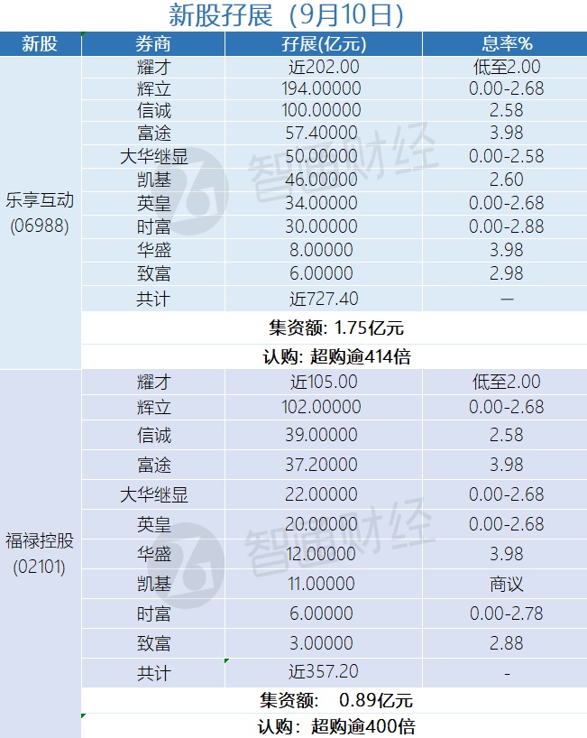 、耀才、信诚等券商合计分别为其借出近727.4亿港元、近357.2亿港元。其中,乐享互动超购逾414倍,福禄控股超购逾400倍。