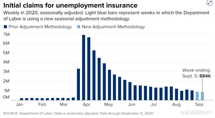 据悉,美国劳工部改变了季节性调整数字的方法,因此过去两周的总数与公共卫生事件早期的报告没有直接可比性。未按季节性因素调整的申请失业金总数为857,148人,比前一周增加20,140人。