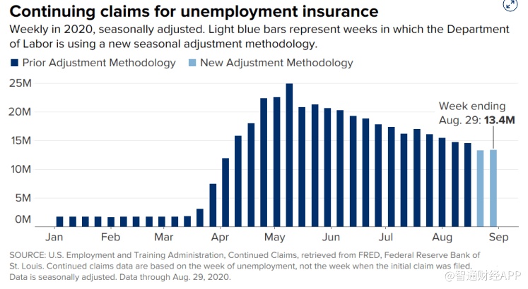 大规模失业援助计划下的申请人数继续攀升,上周增加9万多人至838,916人。虽然截至8月22日,通过所有计划申请失业金的总人数也上升到了2960万多一点。