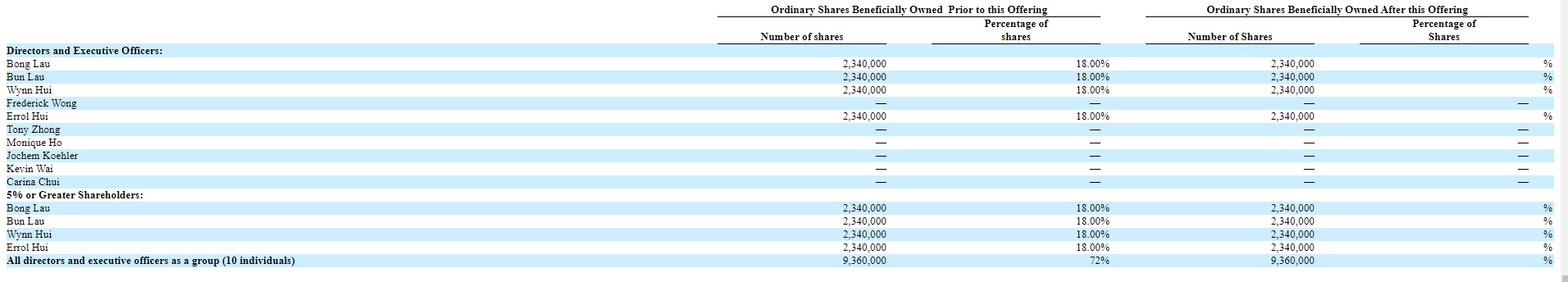 首席运营官Bun Lau持股比例为18%;