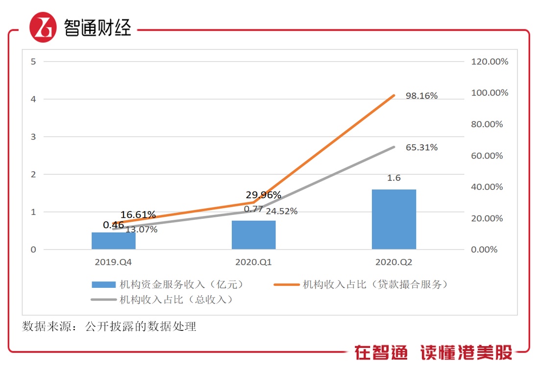 从收入数据看,该公司机构资金服务收入得到大幅度提升,2020年第二季度,实现收入1.6亿元,环比大增107.8%,收入占比贷款撮合服务98.16%,占比总收入65.13%,环比分别提升68.2个百分点及40.79个百分点。