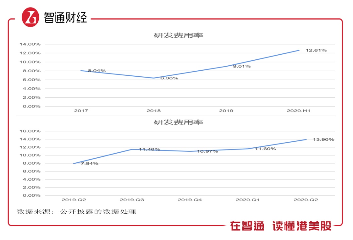 2020年第二季度,该公司研发费用率为13.9%,季度创下历史新高,同比提升5.96个百分点,相比于2018年提升了7.52个百分点。
