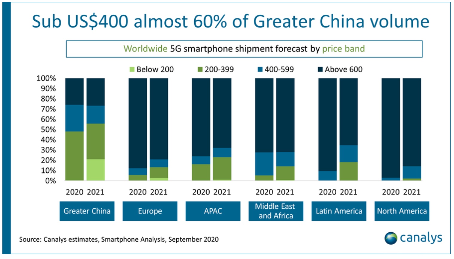 Canalys 认为,5G 智能手机在中国大陆的快速商品化,是今年 5G 智能手机出货量激增背后的一个关键因素。