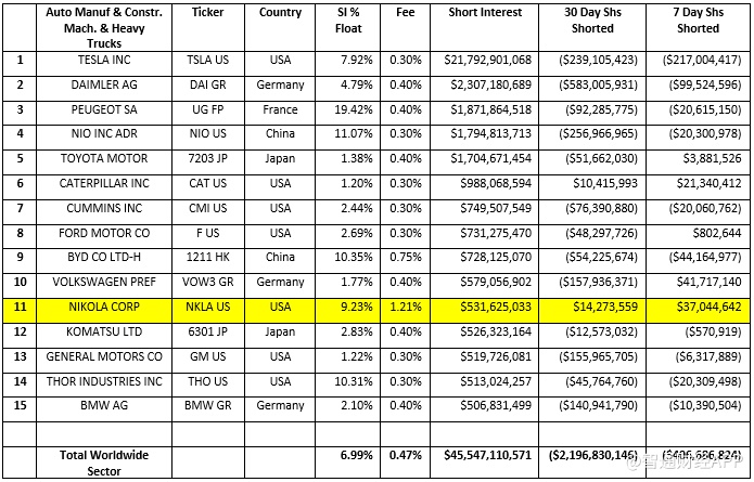 事实上,大量的投资者热衷于做空Nikola。Nikola的空仓规模位列自动汽车制造和工程机械/重卡板块第11位,空头头寸达5.32亿美元,做空股数为1255万股,占其总流通股数的9.23%。Nikola现有卖空者的股票借贷利率为1.21%,但随着新的卖空需求的增加,利率正在上升。9月10日,该股票借贷利率已升至2.5%。
