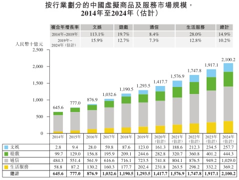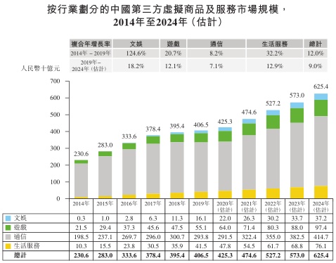 中国是全球最大及增长最快的虚拟商品及服务市场之一,其中第三方服务商更是黄金细分赛道。智通财经APP了解到,文娱、游戏、通信及生活服务为2018年在中国的四个主要虚拟商品及服务类别,按GMV计,中国的虚拟商品及服务市场由2014年的6456亿元人民币(单位下同),增长至2019年的12935亿元,复合年增长率为14.9%,是全球最大及增长最快的虚拟商品及服务市场之一。而受益于人均支配收入增长、在线消费习惯养成、在线泛娱乐行业发展以及产权意识的加强,国内虚拟商品增长未来仍将维持高速。市场预计预计于2024年增至21002亿元,自2019年起继续保持10.2%年复合高增长率。