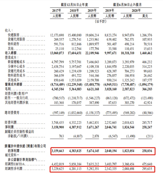 截至2020年6月30日止六个月,中通快递的净利润和非公认会计准则下的经调整净利润分别为人民币18亿元和人民币21亿元。凭着利用规模优势和持续提高的运营效率,中通快递的单票净利润在通达系运营商中是最高的。