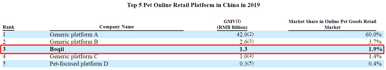 具体而言,截至2019年12月31日,波奇宠物的注册用户数约为2300万,平均MAU为350万;同时,按GMV计算,在中国所有宠物在线零售平台中前五名玩家占据了2019年约67.4%的市场份额,前两家为综合电商平台,而波奇是国内GMV占比最大的垂直宠物平台,市占率为1.9%。