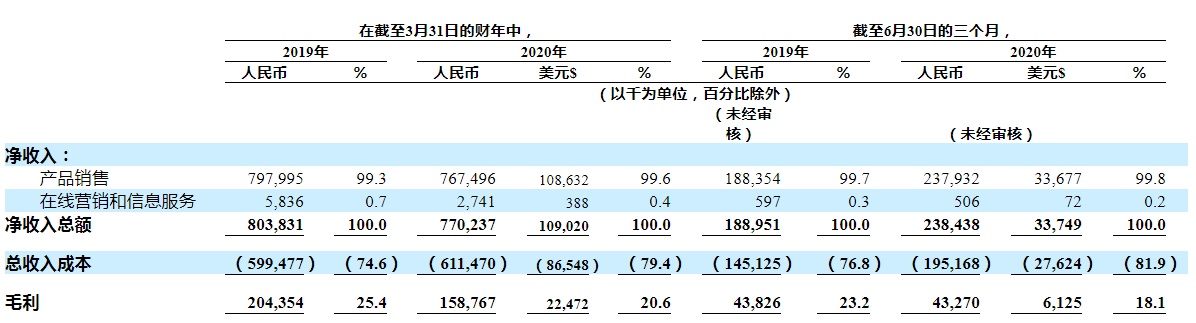 财务数据显示,2020年财年(2019年4月-2020年3月),其实现净收入为为7.7亿元,较去年同期减少4.2%。净收入的下滑主要是产品销售、在线营销和信息服务两大业务收入下滑所致——期内,产品销售业务同比减少3.8%至7.67亿元,在线营销和信息服务同比减少53.8%至274万元。
