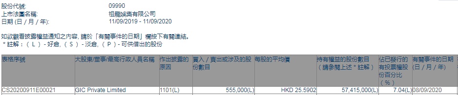 智通财经APP获悉,香港联交所最新资料显示,9月8日,GIC Private Limited增持祖龙娱乐(09990)55.5万股,每股作价25.5902港元,总金额约为1420.26万港元。增持后最新持股数目约为5741.5万股,最新持股比例为7.04%。