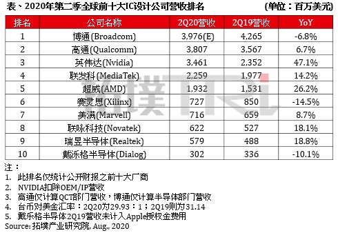 根据TrendForce集邦咨询旗下拓墣产业研究院最新统计的全球前十大IC设计业者2020年第二季营收及排名,英伟达整体营收表现亮眼,营收位列全球IC设计业者第三,并且其营收年成长率47.1%,列居前十大IC设计业者之冠。