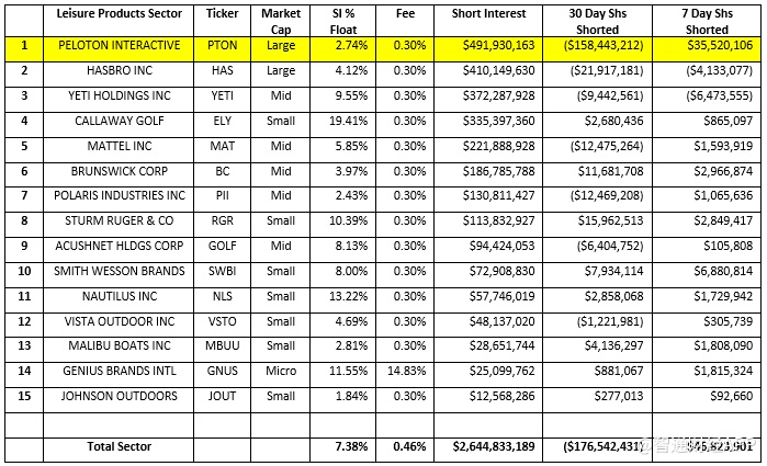 Peloton是美国休闲产品领域空仓规模最大的股票,空头头寸达4.92亿美元,做空股数为540万股,占其总流通股数的2.74%。股票借贷利率仅为0.30%,是借贷利率最便宜的股票之一。
