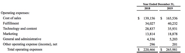 其中公司最大的成本支出是运输成本(即分拣、配送以及运输成本)。根据亚马逊年度报告,这些成本支出总计约为780亿美元(其中402亿美元是物流成本,379亿美元是运输成本)。运输成本支出大约占2019财年总运营费用的30%。