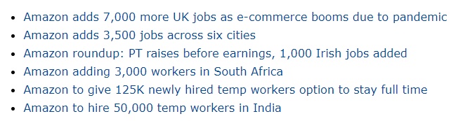 对于亚马逊来说,在过去的几个月里,也就是在第一季度的业绩数据发布之后,就有很多关于公司在全球范围内(如美国、英国、欧洲、非洲、印度、澳大利亚)大幅扩招新员工的新闻得到披露。