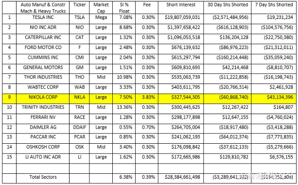 Nikola的空仓规模位列自动汽车制造和工程机械/重卡板块第9位,而几天前位列第11位。空头头寸达3.52亿美元,做空股数为1094万股,占其总流通股数的8.05%。股票借贷利率为3.83%,而9月10日仅为1.21%。