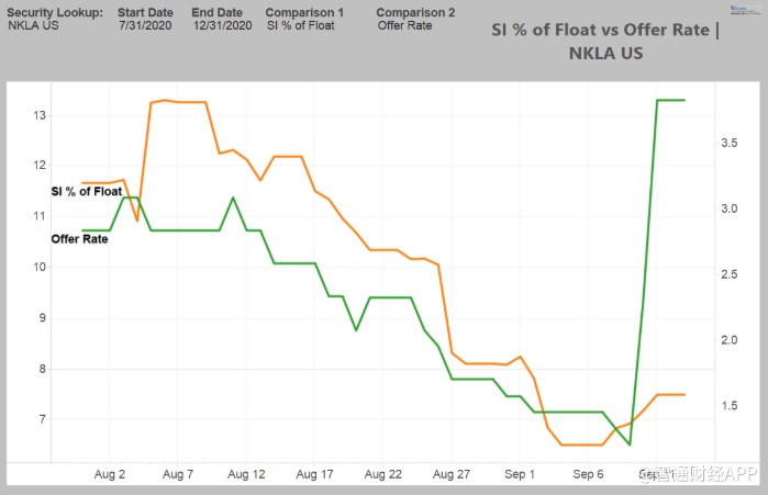 事实上,Nikola的空头交易无法成为近期价格运动的驱动因素,这是因为借入股票的空间有限。在过去的两周里,Nikola的股票贷款利率和做空股数占总流通股数的比例下降。但最近做空股数占总流通股数的比例和股票借款利率都在攀升。供应不足和卖空需求增加将会继续推高股票借款利率。