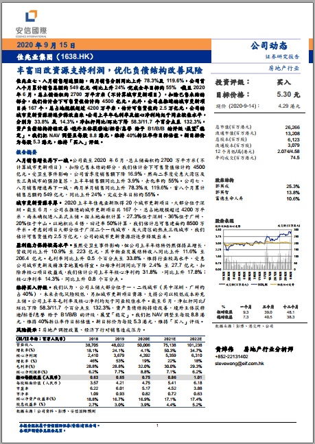 安信国际认为,佳兆业七、八月销售增速强劲,两月销售分别同比上升 78.3%及 119.6%,公司首八个月累计销售总额约 549 亿元,同比上升 24%,完成全年目标约 55%。在土地储备方面,公司截至 2020 年6 月,总土储面积约 2700 万平方米(不计算城市更新项目),扣除已售未结的部分,估计余下可售货值估计约 4500亿元。