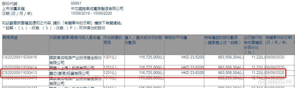 智通财经APP获悉,香港联交所最新资料显示,9月8日,鑫芯(香港)投资有限公司减持中芯国际(00981)11672.5万股,每股作价23.62港元,总金额约为27.57亿港元。减持后最新持股数目约为8.64亿股,最新持股比例为11.22%。