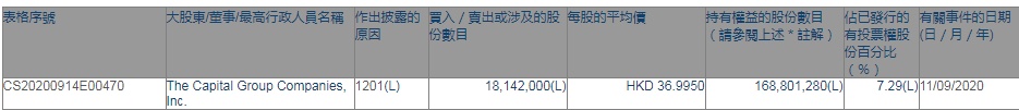 智通财经APP获悉,香港联交所最新资料显示,9月11日,The Capital Group减持华润燃气(01193)1814.2万股,每股作价36.995港元,总金额约为6.71亿港元。减持后最新持股数目约为1.69亿股,最新持股比例为7.29%。
