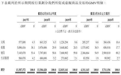 作为行业绝对大龙头的福禄控股,已度过一味追求GMV规模时期,开始注重高利润业务部分。智通财经APP了解到,以2019年收入计,福禄控股是中国最大的第三方虚拟商品及服务平台运营商,市场份额为7.7%;以2019年收入及GMV计,公司是中国最大的第三方文娱相关虚拟商品及服务平台运营商,市场份额分别为11.7%及7.6%;同时,公司也是中国最大的第三方游戏相关虚拟商品及服务平台运营商,市场份额分别为11.8%及6.6%。截至2020年3月31日止12个月,公司的平台合共为超910家虚拟商品提供商及超1450个虚拟商品消费场景促成交易。截至2020年3月31日止三个月,公司完成了超1.15亿份订单,并促成了总GMV37亿元人民币(单位下同)的交易。自福禄控股成立起直至2020年3月31日,公司的平台向超4.6亿名消费者销售了超22000种虚拟商品。