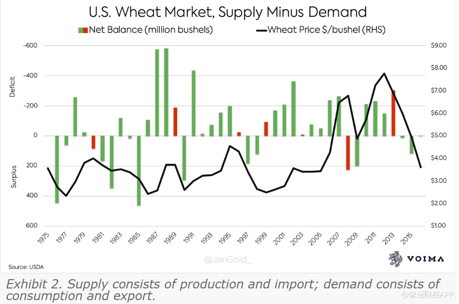 对于易腐商品来说,市场平衡(用供给减去需求)是价格走向的指标。例如,当小麦需求上升时,由于没有大量的库存可以进入市场,小麦供应无法迅速扩大,价格不得不上涨。小麦市场平衡告诉我们,市场的供需状态将引起商品的价格波动。