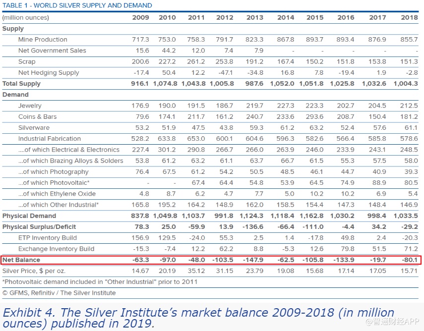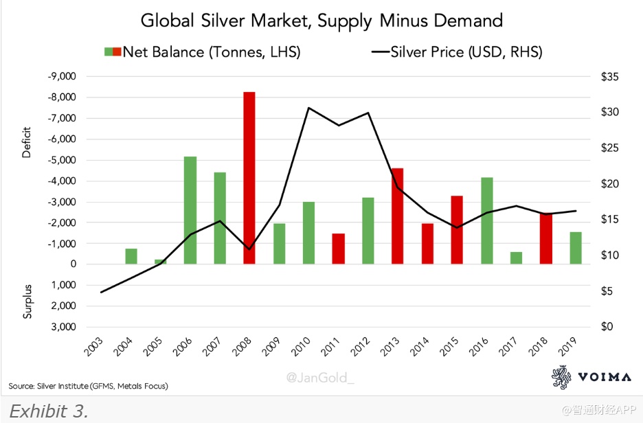 下面的图表显示了白银市场的净平衡,数据来自世界白银协会(Silver Institute)。可以看到,在过去的16年里,市场一直处于赤字状态,而价格却剧烈地上下波动。这表明,所披露的数据具有误导性。
