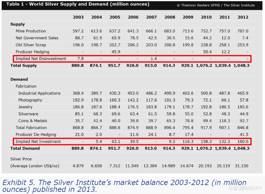 2013年,世界白银协会改变了研究方法。不仅采用了“净余额方法”(表4),数字也发生了变化。往年隐含净投资(盈余),被翻转为隐含净负投资(赤字)。对比表4和表5中2009年、2010年、2011年和2012年的数据可以看出这一点。