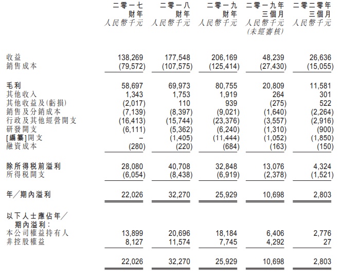 于2017财年、2018财年、2019财年及2020年3个月的收益分别为约人民币1.38亿元、人民币1.79亿元、人民币2.06亿元及人民币2663.6万元。